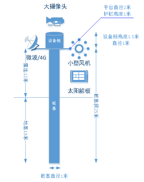 桩基安装:不具备风机安装条件的海上监控视频,直接通过建设海上桩基站,并将视频设备安装于桩基站顶部的形式实现相关点位的视频监控,桩基站建设便捷快速、占地面积小,桩基站管状桩基及上层设备室可采用金属焊接一体成型,直接预留相关设备安装孔位。